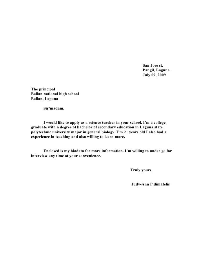 After four years of hard work, blood, sweat, and tears, you finally made it to the point where you walk up that platform with your tassel and receive the diploma, congratulating you for surviving this part of your journey called college. From your job posting, i can tell you are looking for a candidate who is deeply devoted to education and is motivated to work closely with your teachers, doing whatever is necessary to make every class the best it can possibly be. Simple job application for teachers This rule of thumb applies while writing applications for teaching jobs as well. This letter is important to market the skills and experience of the applicant and to create an impression on the kind of employee the employer is looking to hire. Letter of application 153 san jose pangil, laguna september 1, 2009 the principal liceo de pakil pakil, laguna madam, the guidance councilor of your school informed me that your school is in need of a elementary teacher. Are you applying for a job as a teacher? Identify the key skills, certifications, and other qualifications that the employer is seeking. Use a traditional font such as times new roman, arial, or calibri. Or use our cover letter builder to create your own professional document and land a teaching job. View this application letter for a teacher in high school in pdf format. You may also see job templates. This will help you to tailor your cover letter to the position you're applying for.